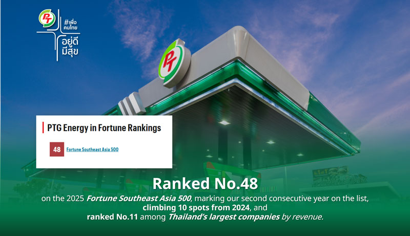 June 17, 2025 – PTG Energy Public Company Limited (PTG) has been ranked among the 2025 Fortune Southeast Asia 500, marking the company’s second consecutive year on the list. PTG has risen from No. 58 to No. 48 among the largest companies in Southeast Asia and now ranks No. 11 among Thailand’s largest companies, according to Fortune magazine’s revenue-based ranking for the fiscal year 2024.