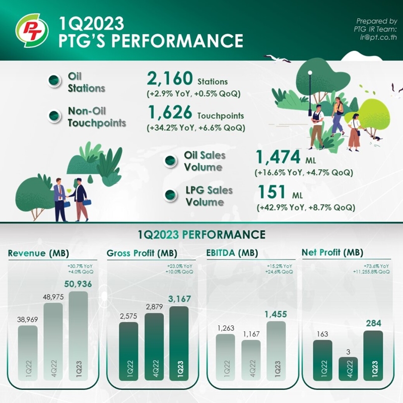 “PTG” ท็อปฟอร์มไตรมาสแรกปี 66 กำไร 284 ล้านบาท เพิ่มขึ้น 73.6% จากไตรมาสเดียวกันของปีก่อน และ 11,255.8% เมื่อเทียบกับไตรมาสก่อนหน้า สอดคล้องการฟื้นตัวเศรษฐกิจประเทศ การท่องเที่ยวฟื้น หนุนทุกธุรกิจ ทั้ง Oil และ Non-Oil รายได้เติบโต ขณะที่ปริมาณขายน้ำมันและก๊าซ LPG ทำสถิติสูงสุดอย่างต่อเนื่องที่ 1,474 ล้านลิตร และ 151 ล้านลิตร ตามลำดับ