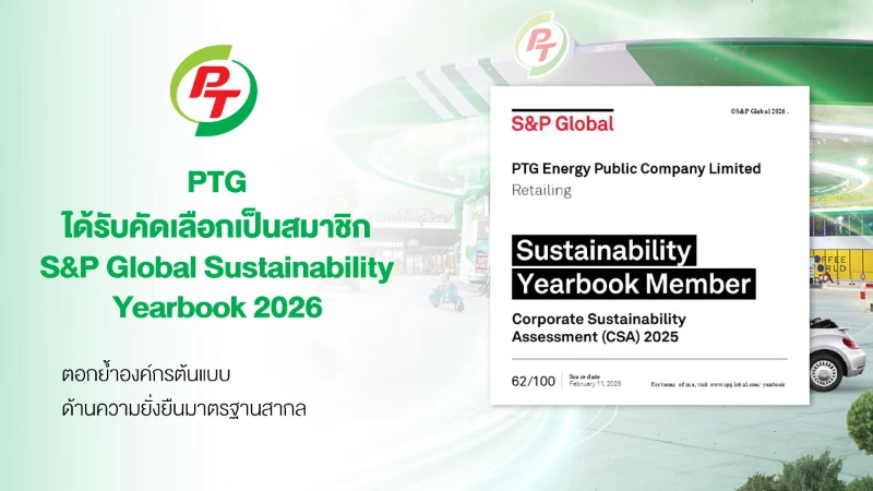 บริษัท พีทีจี เอ็นเนอยี จำกัด (มหาชน) หรือ PTG ได้รับการคัดเลือกเป็นสมาชิก Sustainability Yearbook 2026 ในกลุ่มอุตสาหกรรม Retailing จากผลการประเมิน Corporate Sustainability Assessment (CSA) โดย S&P Global นับเป็นปีแรกที่บริษัทฯ ได้รับการยอมรับในรายงานระดับโลกดังกล่าว ซึ่งเป็นหนึ่งในกรอบอ้างอิงสำคัญด้านความยั่งยืนที่นักลงทุนสถาบันทั่วโลกใช้ประกอบการตัดสินใจลงทุน